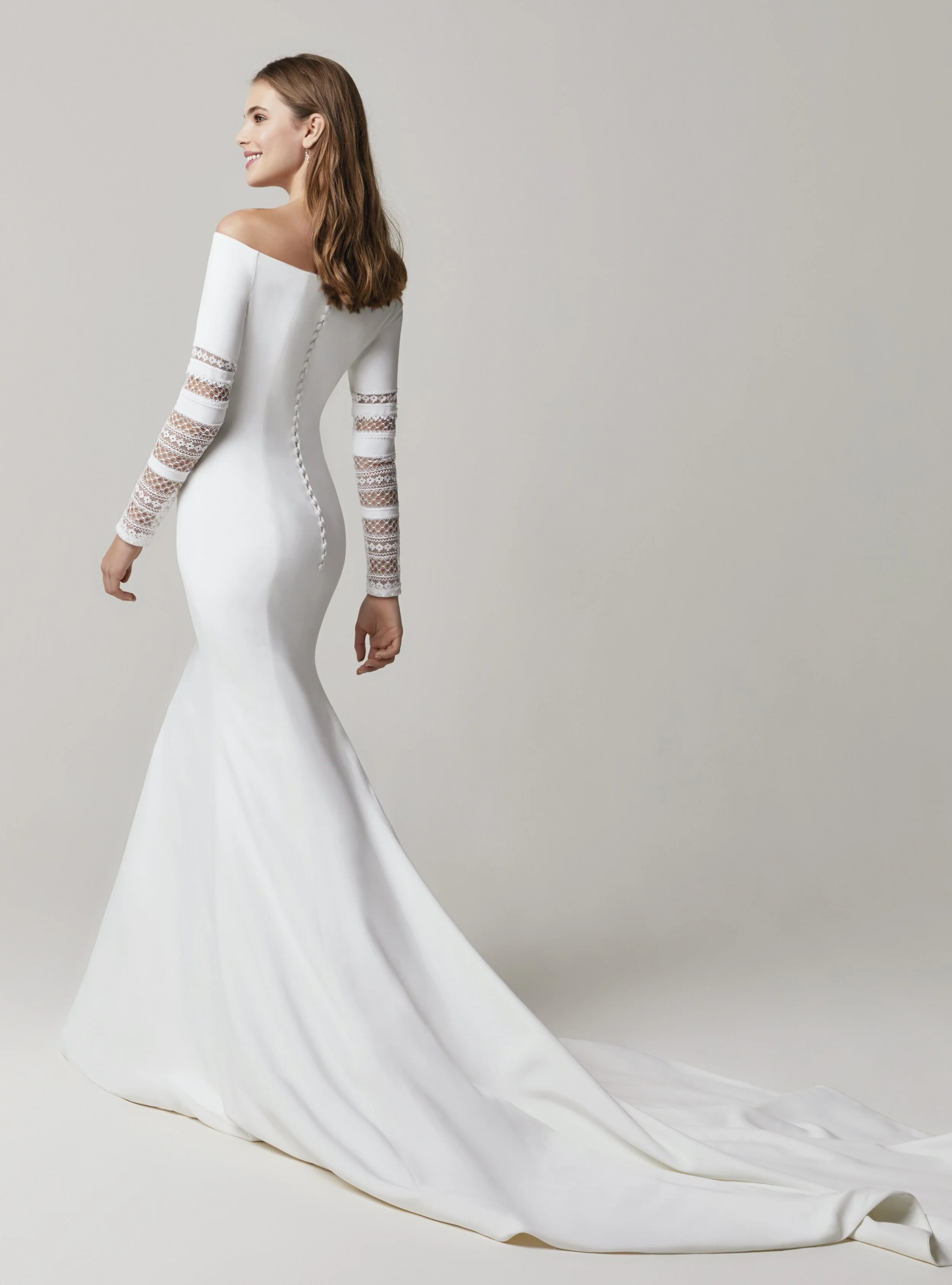 Off the shoulder 3/4 sleeves with lace paneling. A gorgeous fitted skirt with a nice kick out.