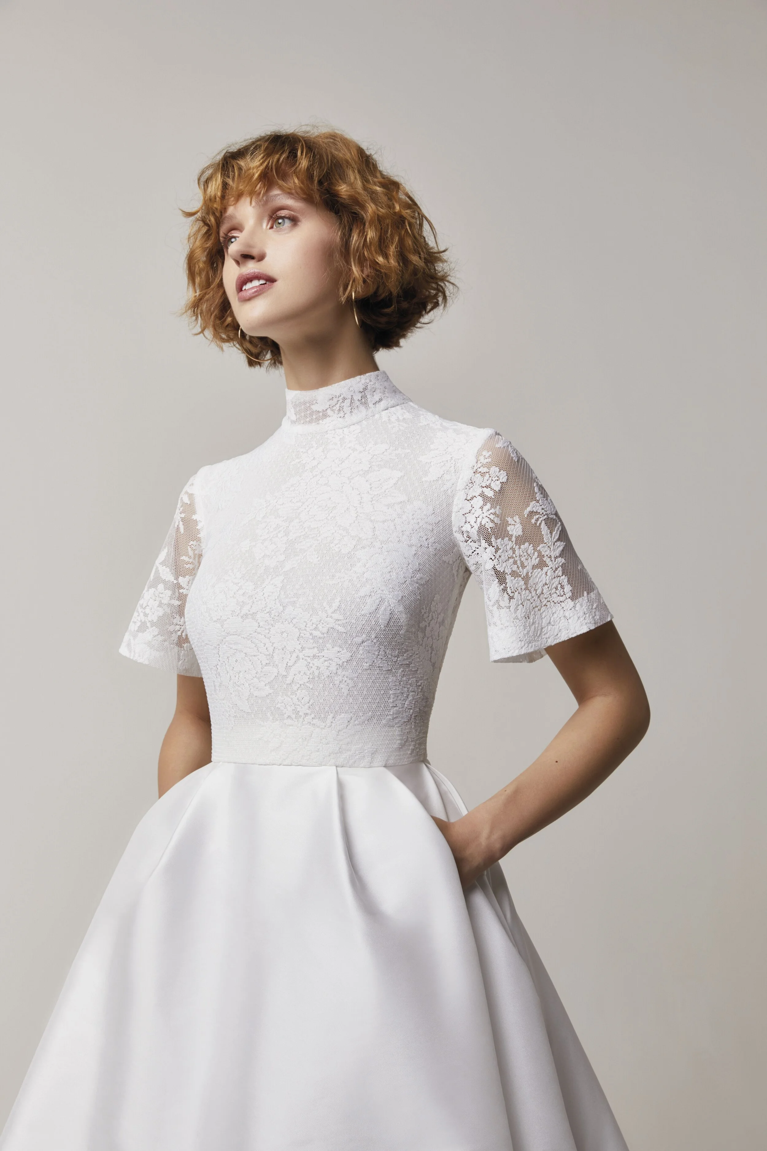 Lace trumpet sleeved A-line number with a high neck and must have pockets!