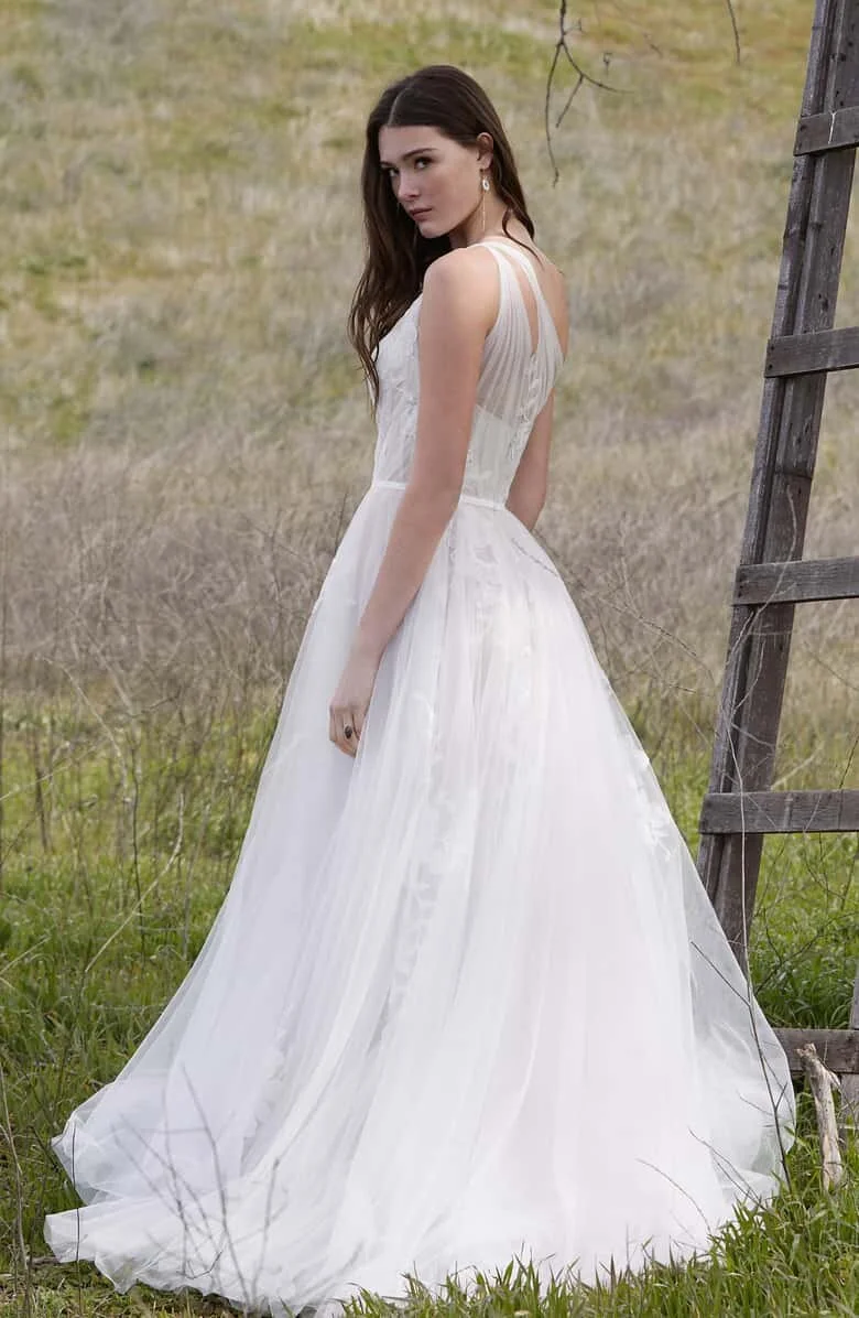 A gown designed for days of heaven and nights of enchantment, we crafted our ethereal one-shoulder style of soft netting with bold accents of lace.
